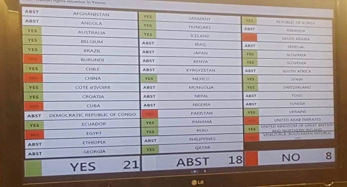 صوت مجلس حقوق الإنسان التابع للأمم المتحدة،اليوم الاثنين، على تمديد فترة عملة لجنة الخبراء الدوليين المكلفين بالتحقيق في جرائم الحرب في اليمن.