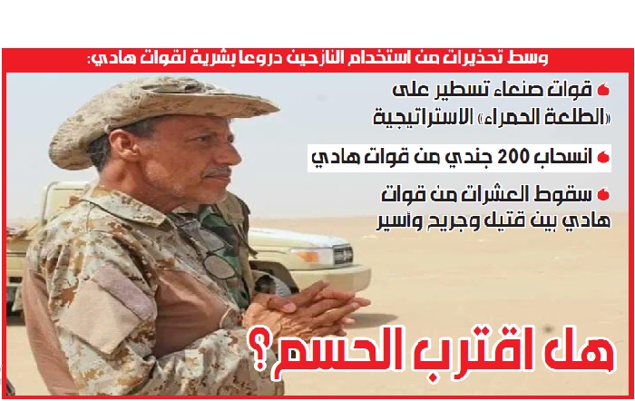 تمكنت قوات الجيش واللجان الشعبية يوم امس الأحد من احراز تقدم عسكري استراتيجي هام في جبهات تخوم مدينة مارب ، فبعد أيام من عمليات الكر والفر التي جرت بين قوات صنعاء والقوات الموالية لهادي وحزب الإصلاح مسنودة بعناصر القاعدة وداعش في محيط التبة الحمراء الواقعة شرق صرواح غربي المدينة، لتنقل بهذا الإنجاز الاستراتيجي الكبير المعركة إلى محيط مدينة مارب.
