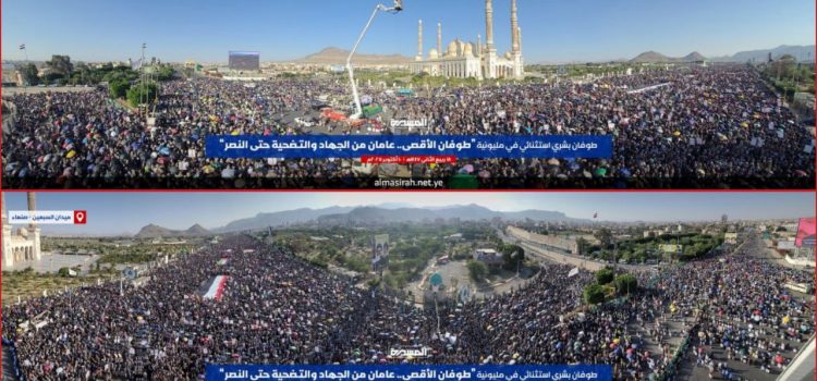 في مشهدٍ يليقُ بعاصمة الصمود ومهوى إرادة الأحرار، احتشدت جموعٌ مليونيةٌ غير مسبوقة في ميدان السبعين بالعاصمة صنعاء، اليوم الجمعة، في مسيرةٍ كبرى حملت شعار “طوفان الأقصى.. عامان من الجهاد والتضحية حتى النصر”، لتكون بمثابة تتويجٍ شعبيٍ عظيمٍ لمسيرة الوعي والموقف والوفاء التي خاضها الشعب اليمني على مدى عامين متواصلين نصرةً لغزة وفلسطين.