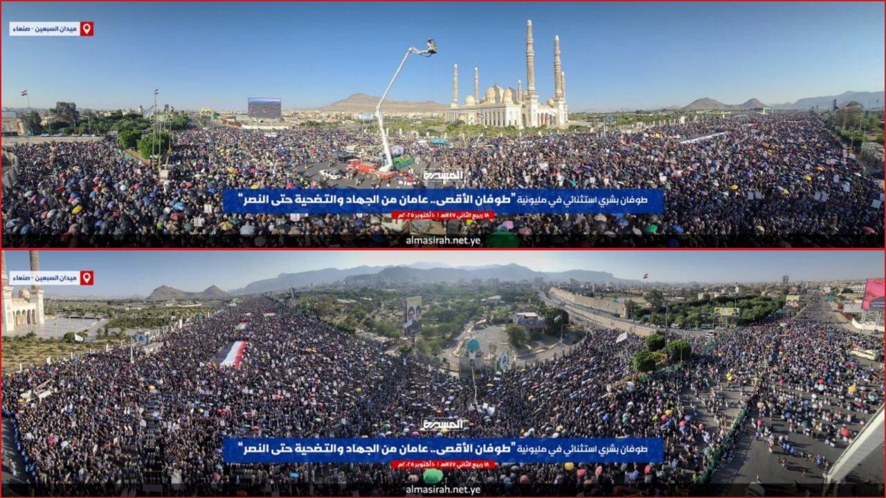 غصّ الميدانُ بالرجال والأطفال الذين توافدوا من مختلف مديريات أمانة العاصمة ومحافظة صنعاء، وهم يرفعون الأعلام الفلسطينية واليمنية، ويرددون الهتافات التي خُطّت بدماء الشهداء وصبر المقاومين، في لوحةٍ وطنيةٍ ودينيةٍ وإنسانيةٍ نادرةٍ تجسد عمق انتماء هذا الشعب لقضايا الأمة ووفاءه لدماء المظلومين في غزة