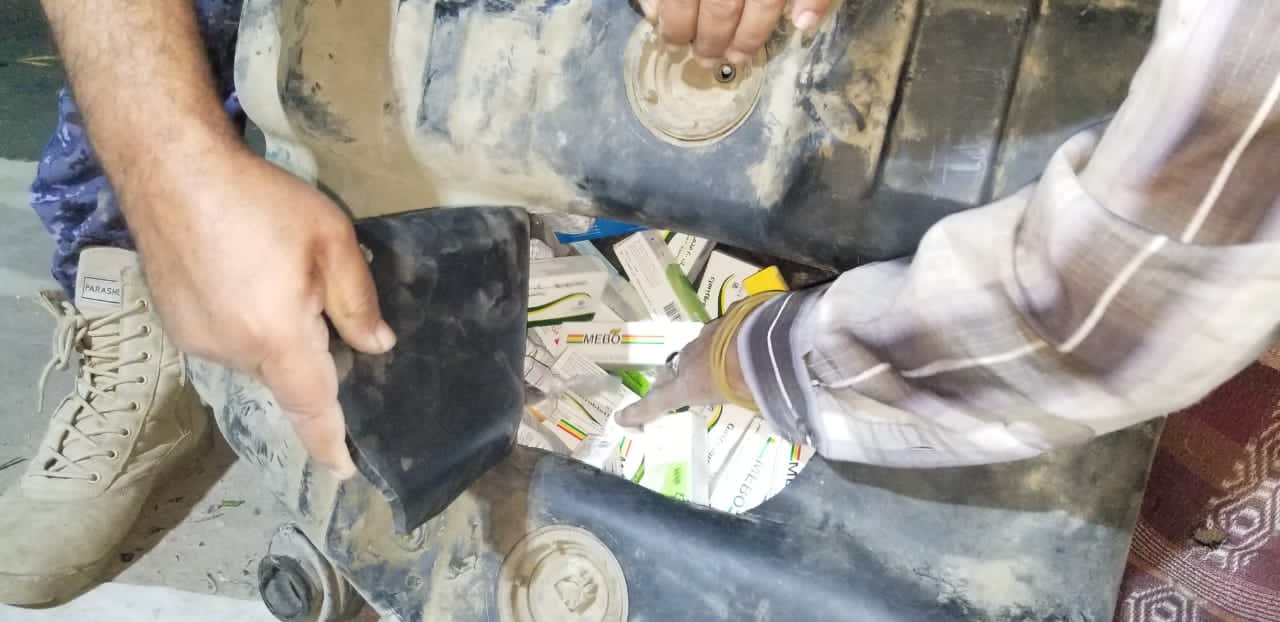 وبحسب محضر الضبط، فإن المضبوطات تقدر بـ (14) كرتونًا من الأدوية ذات منشأ مصري وفرنسي وهندي وألماني وإماراتي، وقد تم إخفاؤها في مكان سري أسفل كرسي الركاب، وأثناء التفتيش الدقيق تم العثور على المهربات.