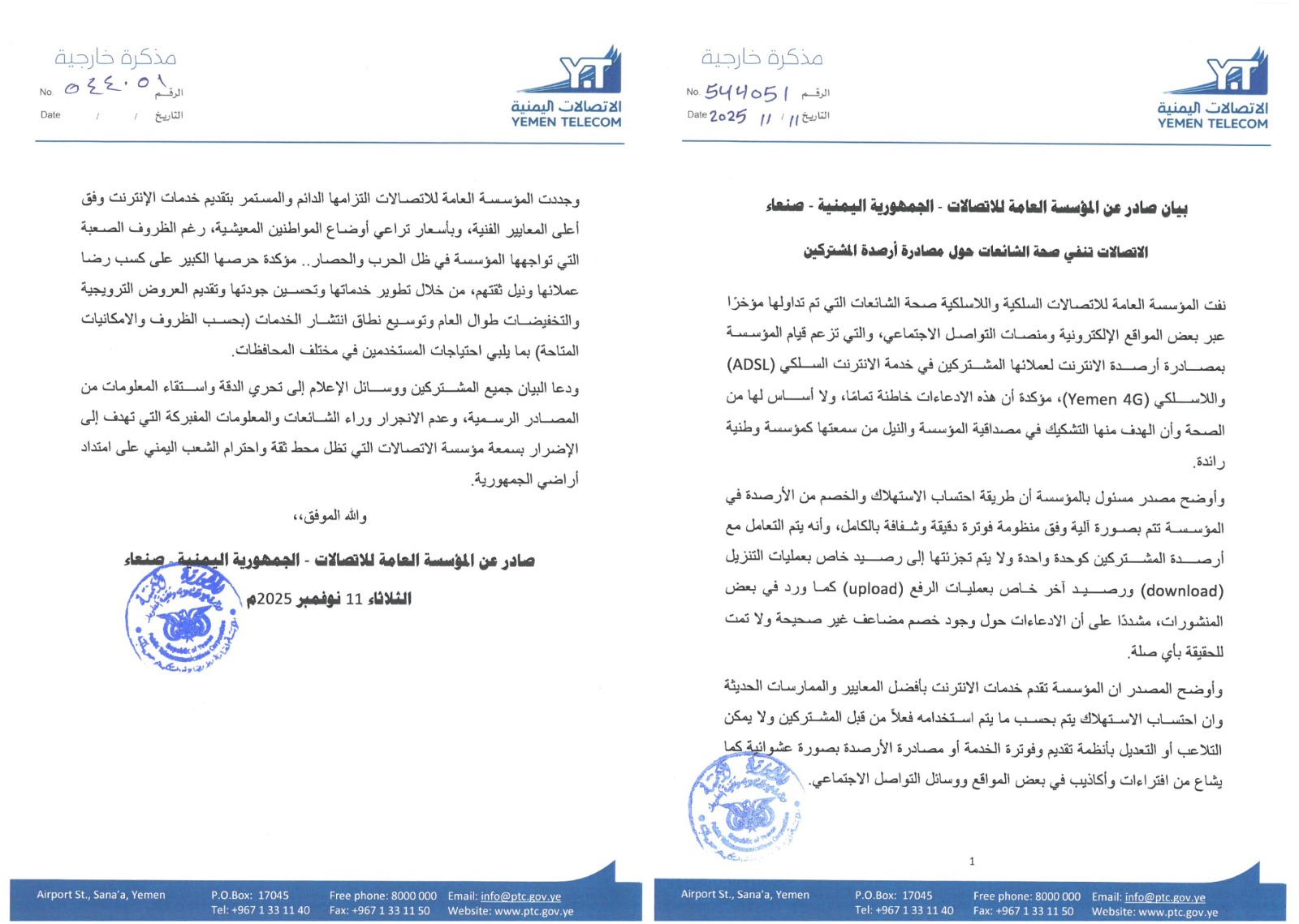 ودعا البيان جميع المشتركين ووسائل الإعلام إلى تحري الدقة واستقاء المعلومات من المصادر الرسمية، وعدم الانجرار وراء الشائعات والمعلومات المفبركة التي تهدف إلى الإضرار بسمعة مؤسسة الاتصالات التي تظل محط ثقة واحترام الشعب اليمني على امتداد أراضي الجمهورية.