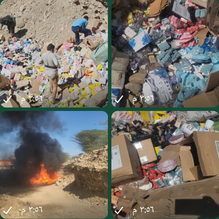 وأوضح التقرير أن البضائع المُتلفة تتضمن أصناف متعددة من الأدوية المخدرة والمنشطات الجنسية والمكملات الغذائية والعسل الحيوي، بالإضافة إلى 60 كرتونًا من التبغ ومشتقاته وأدوات وشيش إلكترونية ومستلزماتها، و3 كراتين حبر طابعات، وكرتون مسدسات خرز خاصة بالأطفال، وكرتون مواد زراعية، إلى جانب 4 كراتين أحذية، و8 كراتين زيوت، و3 كراتين أدوات تجميل و8 كراتين مواد خام.