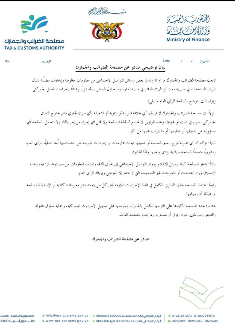 تابعت مصلحة الضرائب والجمارك ما تم تداوله في بعض وسائل التواصل الاجتماعي من معلومات مغلوطة وإيحاءات مضلِّلة بشأن الميزان المستحدث في مديرية دمت أو الميزان القائم في مدينة ذمار، وما حاول البعض ربطه زورًا وبهتانًا بإجراءات العمل الجمركي.
