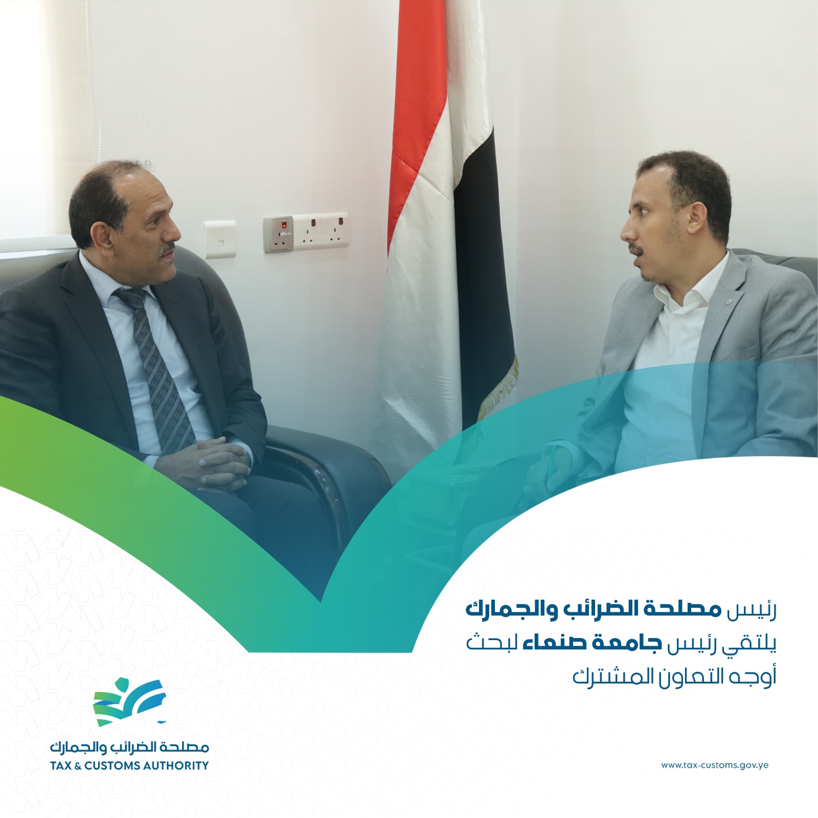 التقى رئيس مصلحة الضرائب والجمارك الدكتور إبراهيم مهدي، اليوم، رئيس جامعة صنعاء الدكتور محمد أحمد البخيتي، لمناقشة سبل تعزيز التعاون المشترك بين المصلحة والجامعة في مجالات التأهيل والتدريب وبناء القدرات.