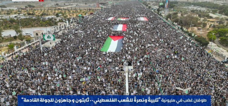 وفي الحشد المليوني الذي خرج تحت شعار “تلبية ونصرة للشعب الفلسطيني.. ثابتون وجاهزون للجولة القادمة”، رفع أحرار اليمن العلمين اليمني والفلسطيني، ورايات البراءة من الأعداء، وصور غلاف المصحف الشريف.
