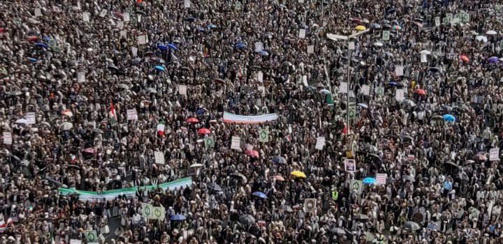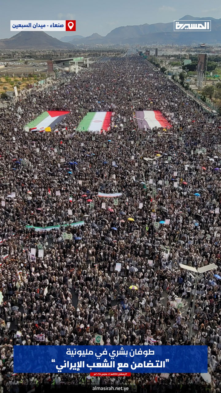 شهد ميدان السبعين بالعاصمة صنعاء، عصر اليوم، مسيرة مليونية كبرى تضامنًا مع الشعب الإيراني، وتنديدًا بالعدوان الأمريكي الإسرائيلي عليه، في مشهد جماهيري واسع جسّد عمق الموقف الشعبي الداعم للقضايا الإسلامية، وفي مقدمتها الجمهورية الإسلامية الإيرانية، في مواجهة قوى الاستكبار.