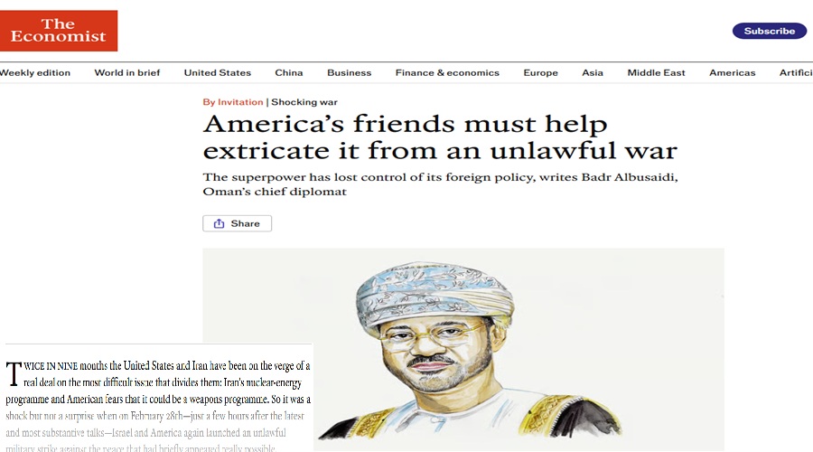 دعا وزير خارجيةسلطنة عُمان بدر البوسعيدى، في مقالٍ له بصحيفة “الإيكونوميست” الصادرة بالإنجليزية، الأربعاء، بأنّ “على أصدقاء أمريكا المساعدة في إخراجها من حربٍ غير مشروعة”، مشدّدًا على أنّ الدول العربية التي كانت تثق بالتعاون الأمني الأمريكي “باتت تعاني من هذا التعاون”.