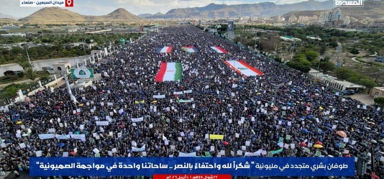 استجابة لداعي الدين والإنسانية، لبّى الشعب اليمني الأبي دعوة السيد القائد عبد الملك بدر الدين الحوثي، للحضور المليوني والكبير في مليونية “شكراً لله واحتفاءً بالنصر.. ساحاتنا واحدة في مواجهة الصهيونية”؛ احتفاءً بانتصار الجمهورية الإسلامية وكل قوى محور الجهاد والمقاومة على العدوين الصهيوني والأمريكي، وإرغامهما على القبول بشروط إيران، وتأكيداً على ثبات الموقف اليمني في مناصرة الشعوب التي تتعرض للاعتداءات الصهيونية، وفي مقدمتها اليوم لبنان وفلسطين.