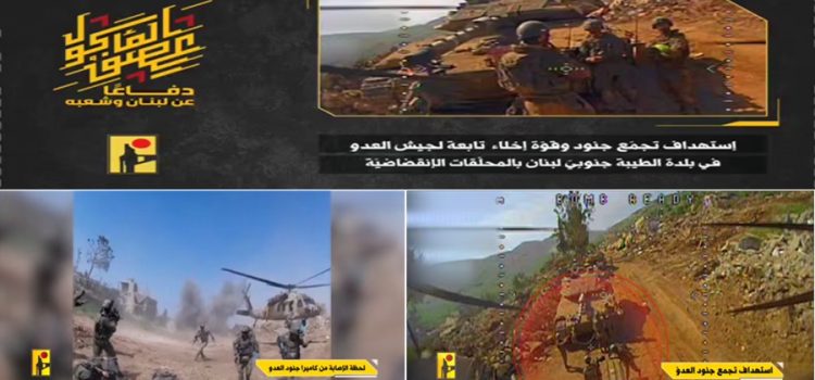 كما عرض الإعلام الحربي للمقاومة مشاهد من عملية استهداف المقاومة الإسلامية “تجمّع جنود وقوة إخلاء تابعين لجيش العدو الإسرائيلي في بلدة الطيبة جنوبي لبنان بمحلّقتين انقضاضيّتين”، ووثقت المشاهد لحظات الاستهداف وهروب مروحية العدو تاركةً خافها القتلى والجرحى وحالةً من الهلع والإرباك في صفوف جنود العدو، ما يثبت أن اليد العليا في الميدان هي للمقاومة التي ترفض تدنيس الأرض وسياسة هدم البيوت والاعتداء على السيادة.
